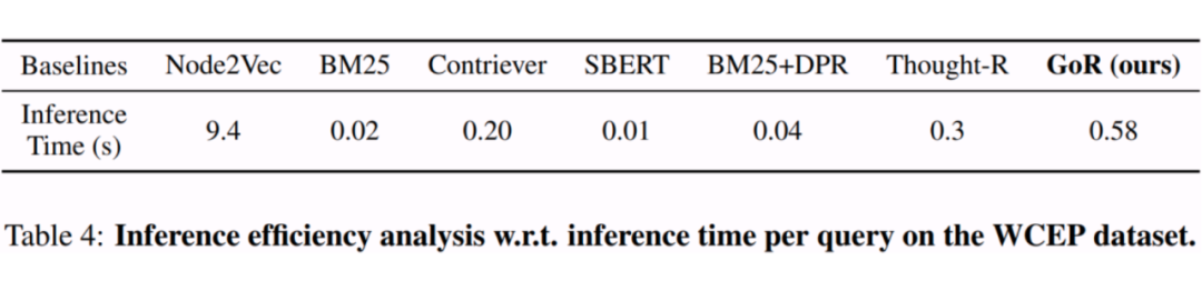 同时,推理效率分析显示,GoR 的延迟仅比普通 RAG 多出几百毫秒,几乎不影响实时性。