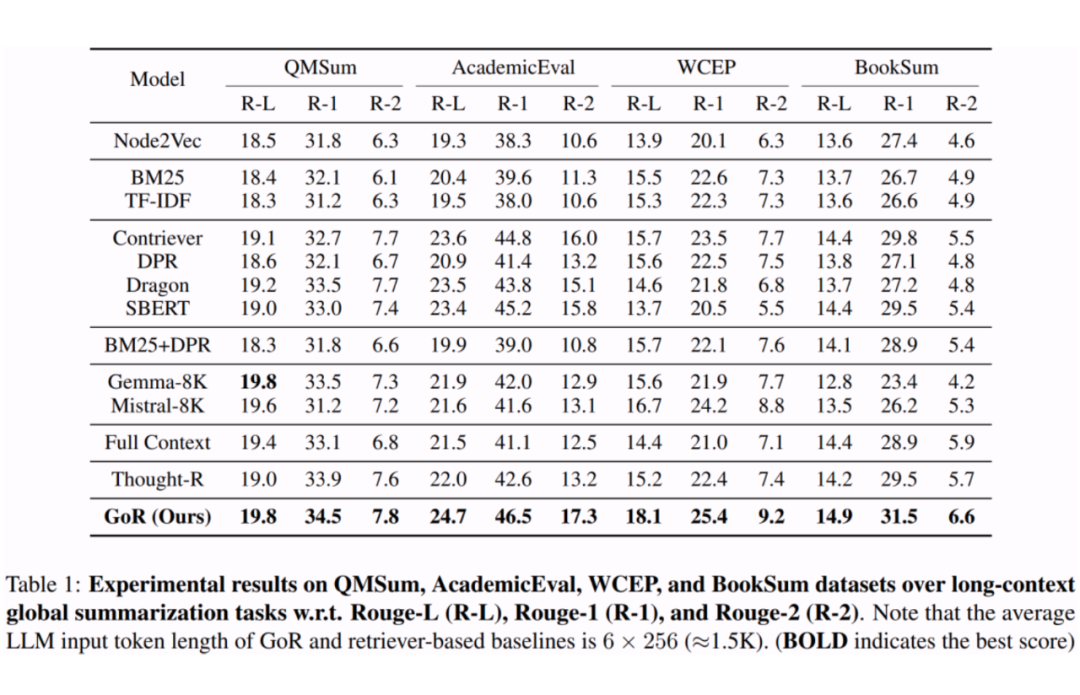 结果显示,GoR 在所有指标上均显著优于包括 BM25、Contriever、Dragon、Thought-Retriever 在内的若干主流 Baseline。相比长上下文 LLM,GoR 的输入长度更短,却获得了更好的摘要质量与更低的成本,显示出强大的信息压缩与结构建模能力。