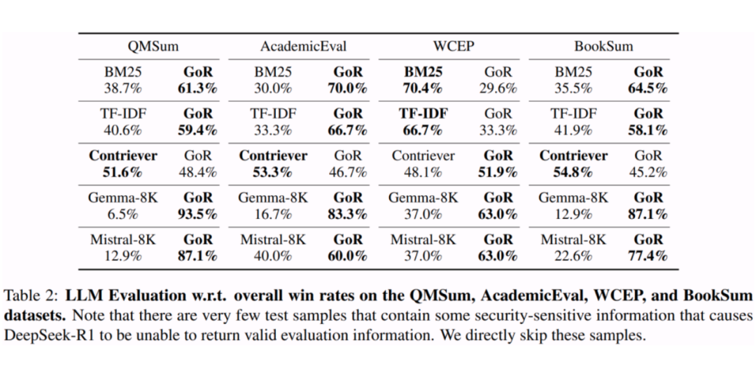 此外,基于 DeepSeek-R1 的 LLM Judge 分析显示,GoR 在摘要的完整性、多样性与信息量三项指标上均获得最高综合得分。