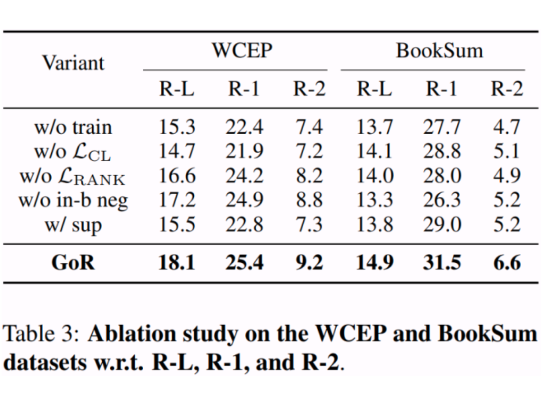 作者通过大量消融分析实验发现:(1)删除图神经网络训练(w/o train)导致性能显著下降;(2)删除对比损失或排序损失(w/o L_CL,w/o L_RANK)造成 Rouge-L 指标显著降低;(3)将自监督训练替换为传统的监督学习训练(w/ sup)使性能大幅退化。