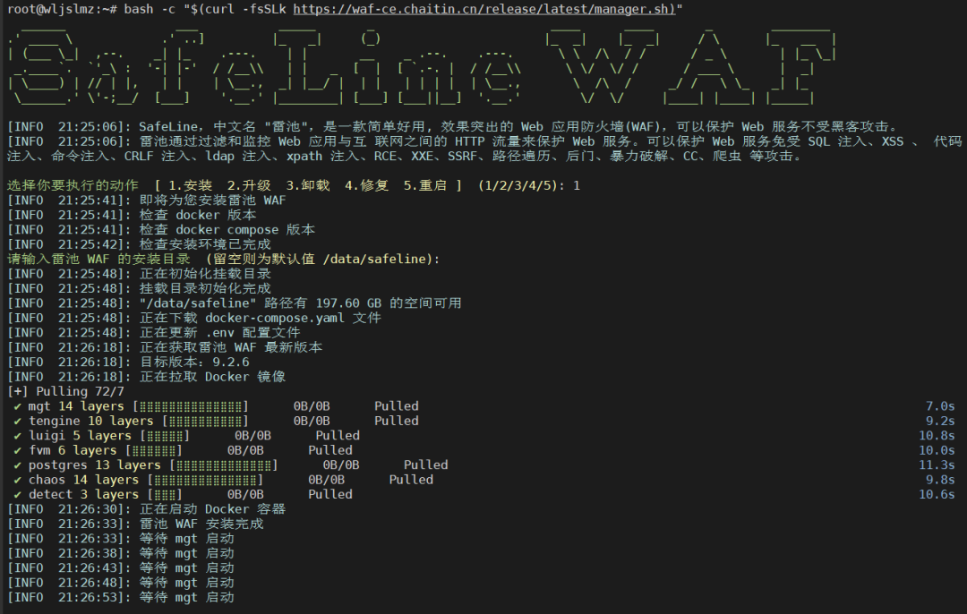 首先,在服务器上运行这条命令:bash -c "$(curl -fsSLk https://waf-ce.chaitin.cn/release/latest/manager.sh)"(如果是国内用户,用国内镜像避免网络问题)。