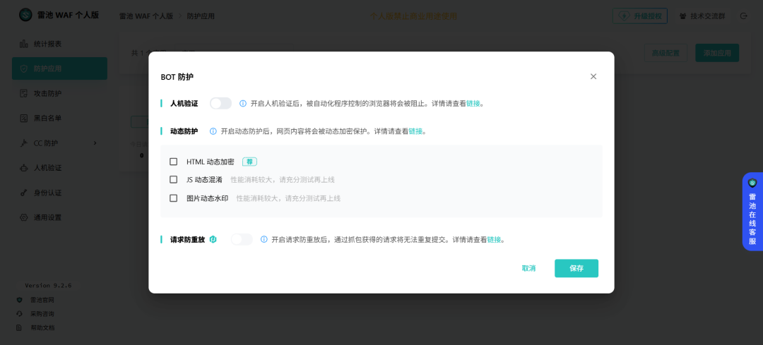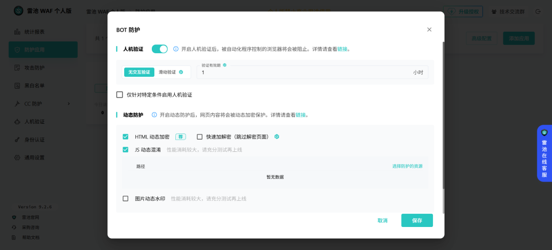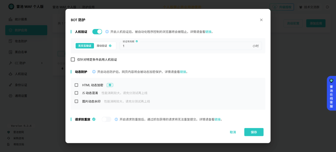 - 人机验证:点开开关,当检测到可疑行为时,会弹出验证码挑战。测试时,我用工具模拟攻击,果然被挡住,而正常浏览器访问无感。