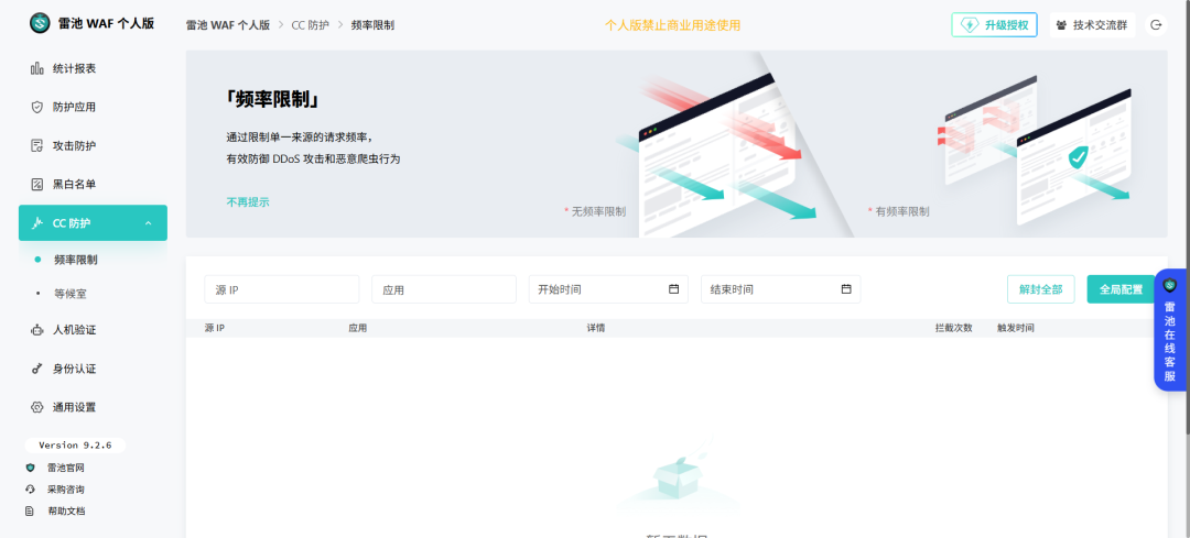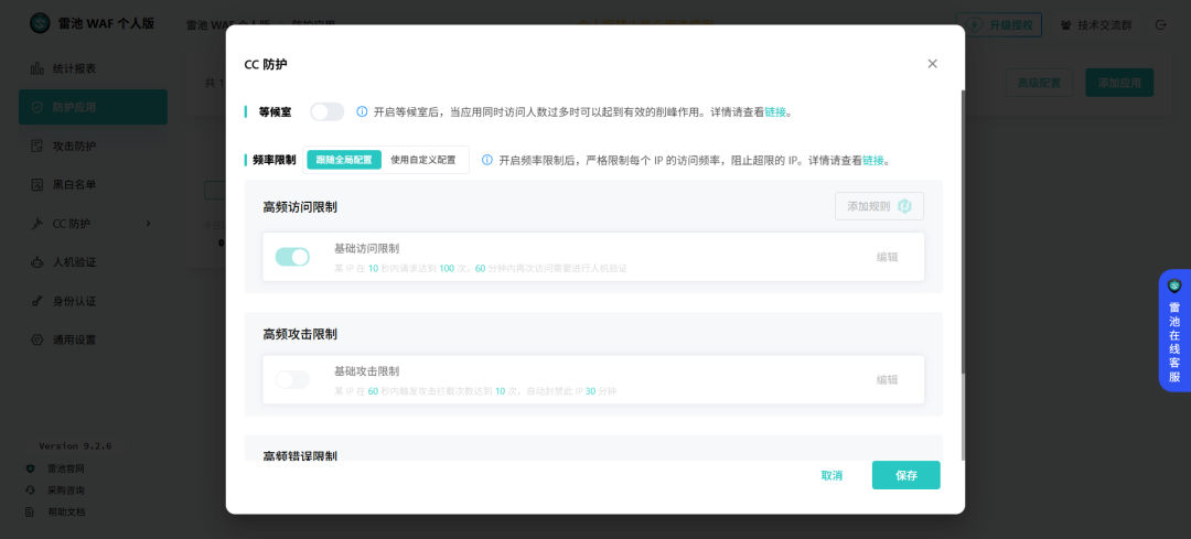 - 对于CC防护(防洪水攻击),去“频率限制”设置每分钟请求上限,比如单IP限100次,超出就进“等候室”排队。这在高并发场景下特别实用。