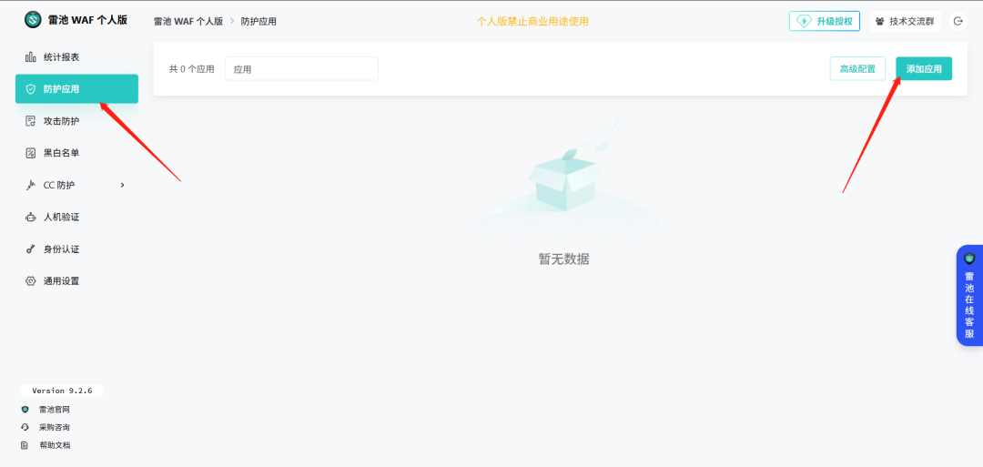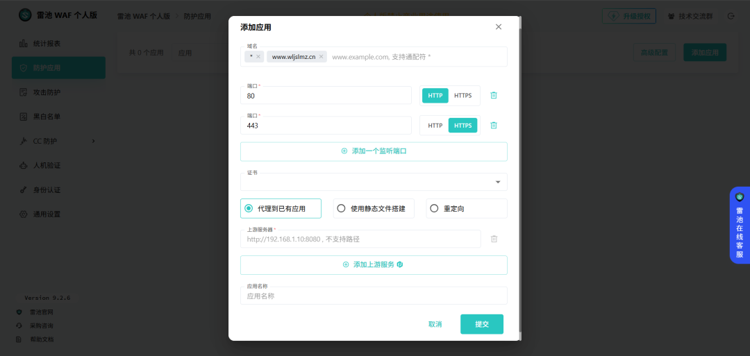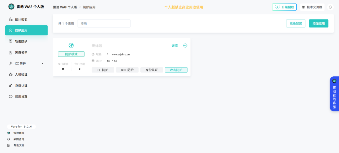 - 在控制台点击“防护应用” > “新增应用”,输入你的域名和源站IP/端口(比如www.wljslmz.cn指向192.168.0.5:80)。