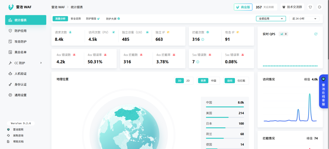 客观来说,雷池社区版的亮点在于其核心引擎——智能语义分析算法。这不同于传统WAF的正则匹配,它能深度解码HTTP负载,精准识别威胁,而误报率低。全球装机超30万台,日处理300亿请求,这数据不是吹的。