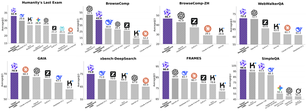具体来说,在Humanity's Last Exam(HLE)、BrowseComp、BrowseComp-ZH、GAIA、xbench-deepsearch、WebWalkerQA以及Frames等评测集中,通义DeepResearch模型以3B激活参数,性能超越了基于OpenAI o3、DeepSeek V3.1和Claude-4-Sonnet等旗舰模型的ReAct Agent。