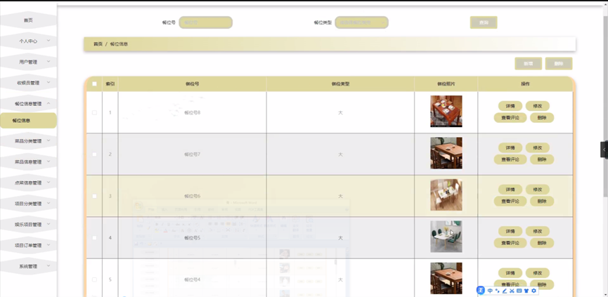 管理员点击餐位信息管理。在餐位信息页面输入餐位号和选择餐位类型进行查询、新增或删除餐位信息列表,并根据需要对餐位详细信息进行详情、修改、查看评论或删除操作;如图5-9示: