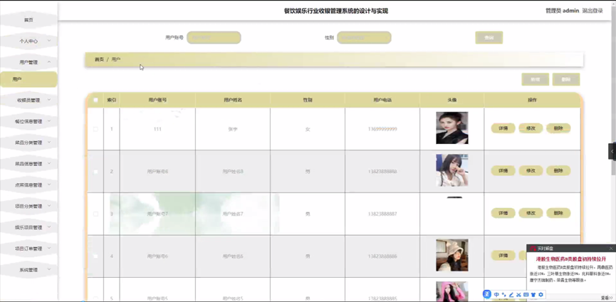 管理员点击用户管理。在用户页面输入用户账号和性别进行查询、新增或删除用户列表,并根据需要对用户详细信息进行详情、修改或删除操作;如图5-7示: