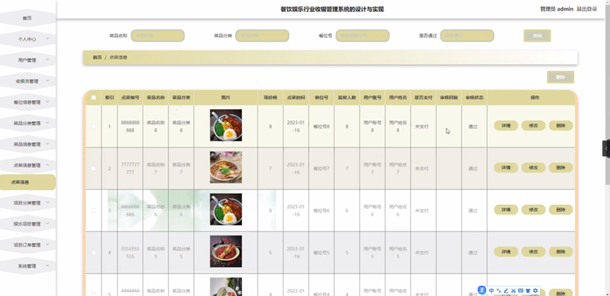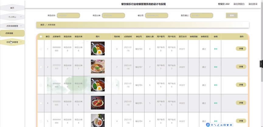 点菜信息管理:点菜编号、菜品明细、价格、餐位号、就餐人数、备注、审核、支付状态