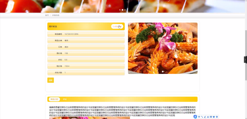 菜品信息:在菜品信息页面的输入栏中输入菜品名称、菜品分类、口味、原价格、折扣、现价格和点击次数进行查询,可以查看到菜品详细信息,并根据需要进行评论、点菜或收藏操作;菜品信息页面如图5-3所示: