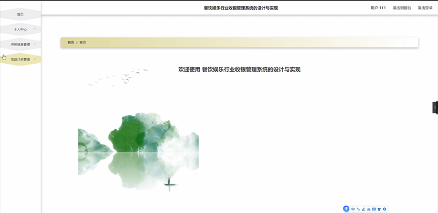当人们打开系统的网址后,首先看到的就是首页界面。在这里,人们能够看到餐饮娱乐行业收银管理系统的设计与实现的导航条,通过导航条导航进入各功能展示页面进行操作。系统首页界面如图5-1所示: