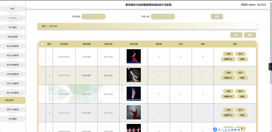娱乐项目管理:项目编号、标题、分类、封面、原价、折扣、现价、简介、详情