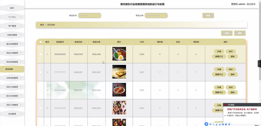 (2)管理员通过后台管理员界面,实现对餐饮娱乐行业收银管理,或发布餐位信息、菜品信息,让用户实时知道最新的餐饮娱乐行业收银管理信息;