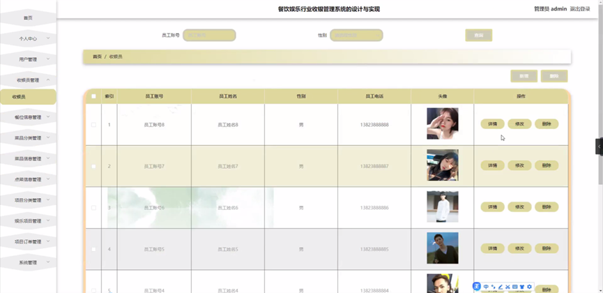 管理员点击收银员管理。在收银员页面输入员工账号和性别进行查询、新增或删除收银员列表,并根据需要对收银员详细信息进行详情、修改或删除操作;如图5-8示: