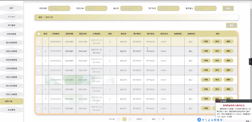管理员点击项目订单管理。在项目订单页面输入项目标题、项目分类、餐位号、用户账号和选择是否通过进行查询或删除项目订单列表,并根据需要对项目订单详细信息进行详情、修改或删除操作;如图5-15示: