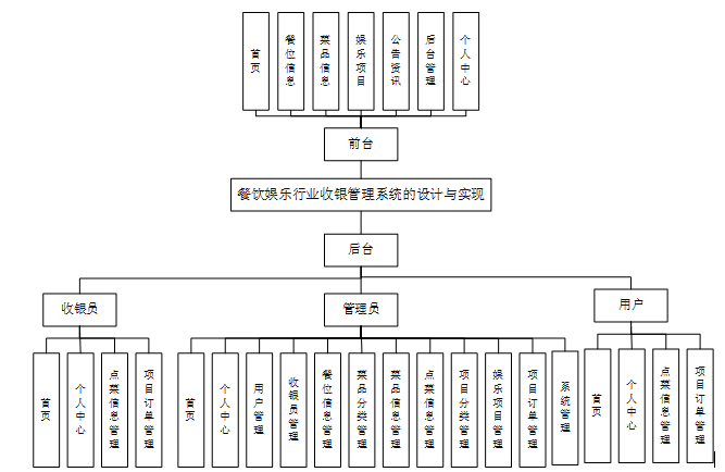 该系统由个人管理员、收银员和用户三部分组成。其中:用户进入系统首页可以实现首页、餐位信息、菜品信息、娱乐项目、公告资讯、后台管理、个人中心等;收银员进入系统首页可以实现首页、个人中心、点菜信息管理、项目订单管理等;管理员则是根据不同需求设置了不同功能,可以通过后台管理接口管理收银员和用户信息。