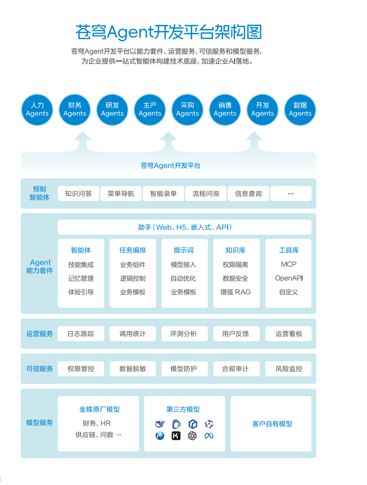 最近看了一些国内厂商的方案,金蝶的苍穹Agent平台算是比较有代表性的一个。它的思路不是从零开始造轮子,而是基于30多年企业服务的业务沉淀,把Agent能力嵌入到已有的企业管理场景里。