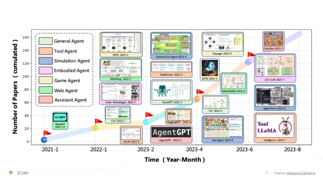 2021 年起相关技术逐步涌现(如 2021 年 12 月 WebGPT),2023 年进入快速发展期,多款代表性 Agent 产品落地,涵盖通用 Agent(General Agent)、工具 Agent(Tool Agent)、游戏 Agent(Game Agent)、具身 Agent(Embodied Agent)等类型(如 2023 年 3 月 AutoGPT、5 月 Voyager、7 月 ChatDev)。