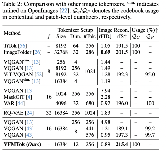 - 更好的图像重建质量:相较于传统的视觉 Tokenizer,VFMTok 可以用更少的 token 数量(仅用 256 个)实现更优的重建质量(0.89 rFID, 215.4 rIS)和更高的码本利用率 (100%),超越了之前大部分传统的离散 Tokenizers。