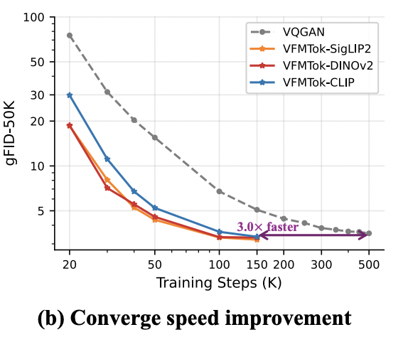 - 更快的生成训练收敛速度:相比于经典的 VQGAN 这类 Tokenizer,VFMTok 能够显著提升自回归模型训练阶段的收敛速度 —— 训练收敛速度提升了 3 倍。