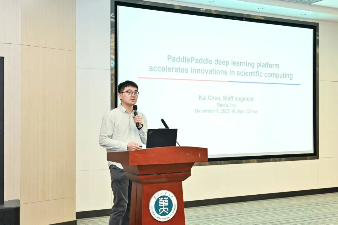 陈凯博士代表百度飞桨发表了题为《PaddlePaddle深度学习平台加速科学计算技术创新》(PaddlePaddle deep learning platform accelerates innovations in scientific computing)的报告,指出深度学习正有效应对科学领域面临的一系列挑战。报告介绍了飞桨深度学习框架,及其在大模型、AI科研工具、力学、气象、材料等领域的应用,并强调开源开放对推动生态协同、加速科研创新的重要作用。