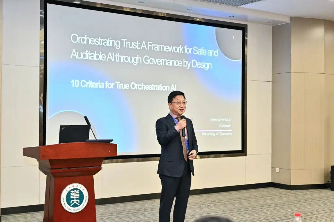 Byeong Ho Kang教授以《通过设计实现治理:构建安全、可审计的人工智能信任框架》(Orchestrating Trust: A Framework for Safe and Auditable AI through Governance by Design)为题作主旨演讲。他指出,当前人工智能面临透明度不足、系统性风险和伦理失准等挑战,传统的单一架构已难以为继。为此,他提出一种名为“协同智能”(Orchestrated Intelligence)的新范式,通过构建可由机器执行的架构,替代以往抽象的治理原则,从而切实提升AI系统的可审计性、可控性与整体治理能力。