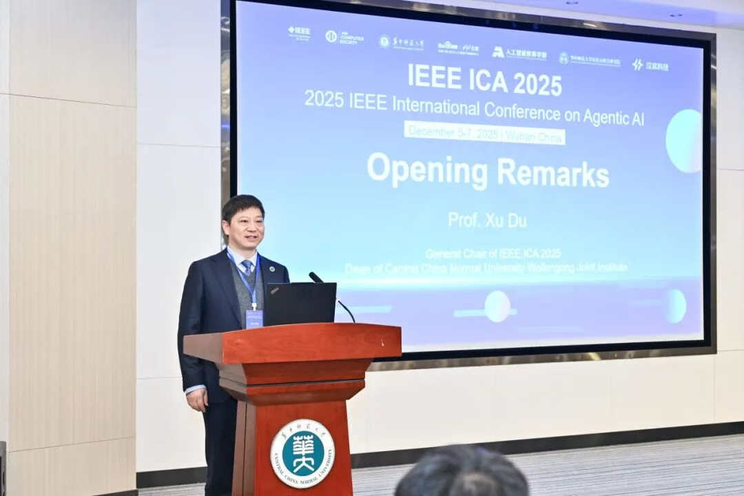 IEEE ICA 2025会议主席、华中师范大学伍伦贡联合研究院院长杜旭发表致辞。他表示,本次大会围绕“自主智能体”主题展开,与华中师范大学伍伦贡联合研究院“人智共进”的育人理念高度契合。本届会议共收到来自16个国家和地区的90篇投稿,经严格双盲评审录用59篇,其中长文录用率为39%。他强调,会议为师生提供了与国际顶尖学者交流的平台,并感谢技术委员会、评审专家及合作伙伴的大力支持。