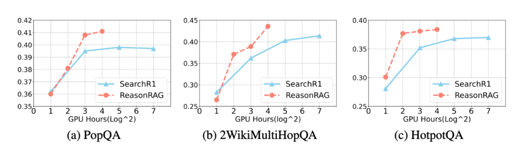 ReasonRAG 在 PopQA、HotpotQA 和 2WikiMultiHopQA 上的 EM 表现随 GPU 小时数增长,始终快于 Search-R1,表明其更高的训练效率。