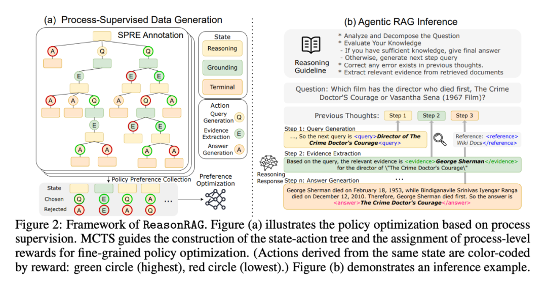 第二步:推理路径不拍脑袋,用树来找。面对海量可能的思维路径,ReasonRAG 不靠直觉决策,而是借助蒙特卡洛树搜索(MCTS),系统性地搜索“查不查、答不答”的多轮组合。每一次推理都像走迷宫,通过状态-动作树,逐步逼近最佳路径。