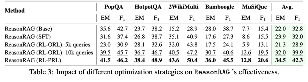 结果显示,ReasonRAG 在所有数据集上均取得最佳性能,表明过程奖励所带来的精细化反馈机制更有助于学习复杂的推理策略。