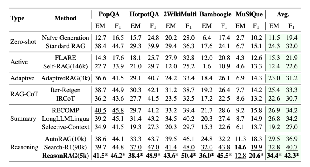 实验结果令人瞩目:在多个权威评测集上,ReasonRAG 仅使用 5k 条训练数据就超越了需要 90k 条数据训练的 Search-R1 模型,展现出卓越的数据效率和推理能力。