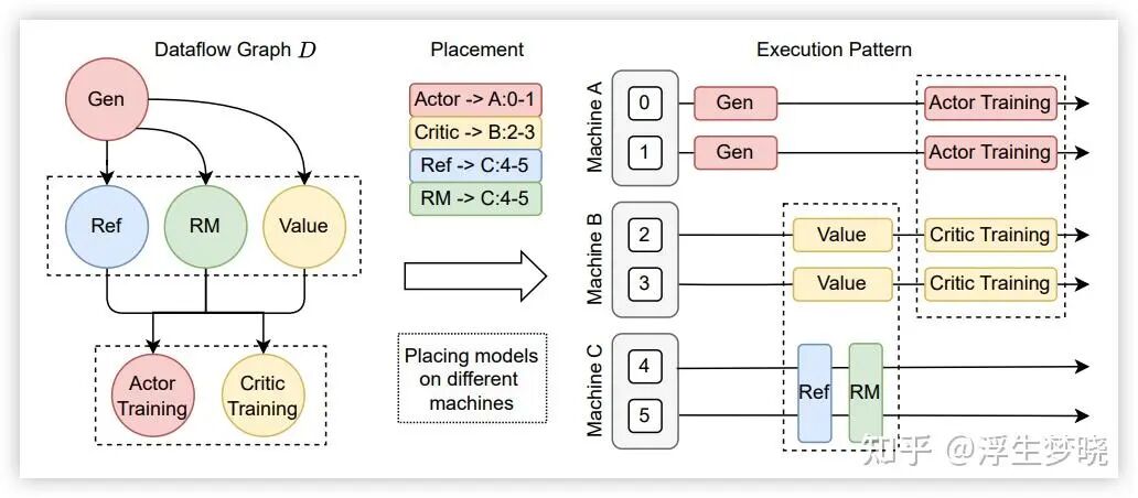 在 verl 中将传统的 rlhf 训练的流程看成一个数据流图,数据在 actor、critic、reference、reward 中进行流转,最后来计算 PPO 公式得到损失,再对 actor 进行反向传播,参照下图: