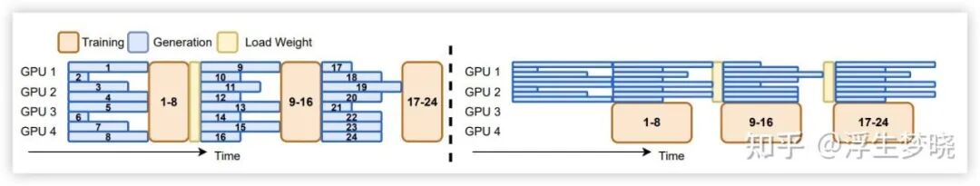 从图中就可以看到同步方案会存在很多 bubble,且推理时存在训练资源浪费,训练时存在推理资源浪费。