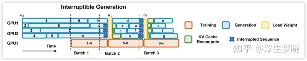 当推理引擎完成参数更新后继续对之前截断的任务进行 rollout,也就是说这部分任务 rollout 轨迹前部分是旧策略模型生成的,后部分是新策略模型生成的。