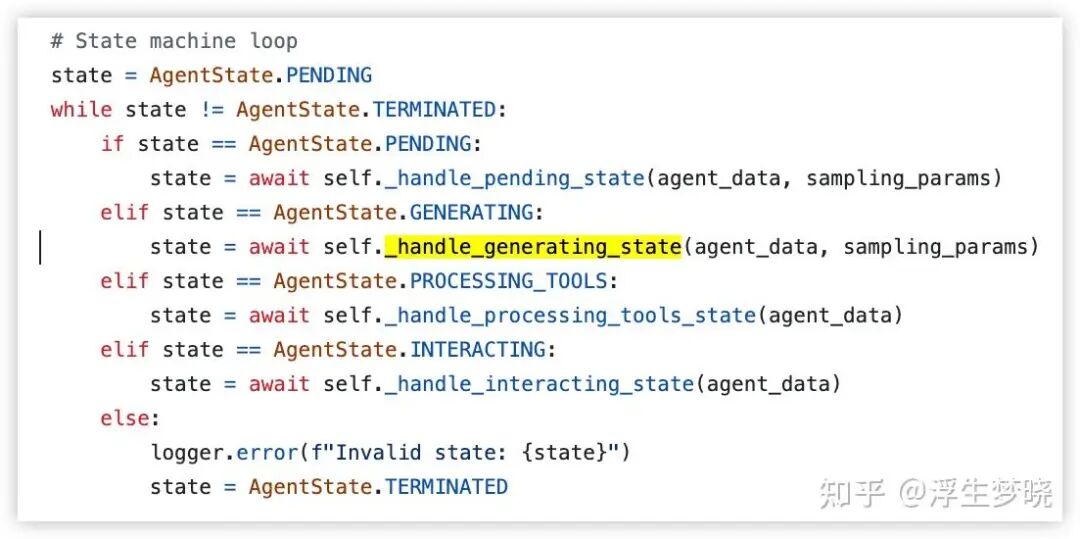 这种交互方式实际上涵盖了一般的 agent 多轮的状态,比如执行完 self._handle_generating_state 后,也就是推理引擎输出了内容。