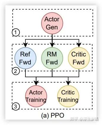 之前开源的 RL 框架基本上都是训练和推理同步的架构方案,典型代表像 verl,verl 实现了这几个模型的简单命令编排,但没有改变同步运行的本质,也就是整个训练流程都要遵循下图中 1,2,3 来进行,先推理后训练。