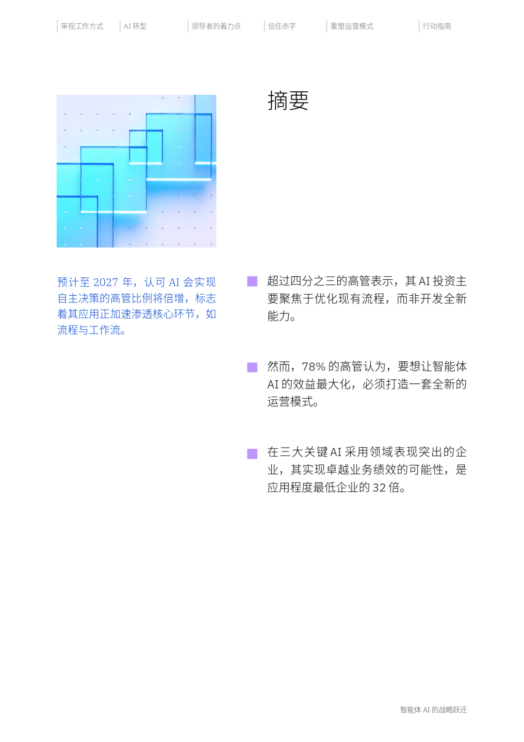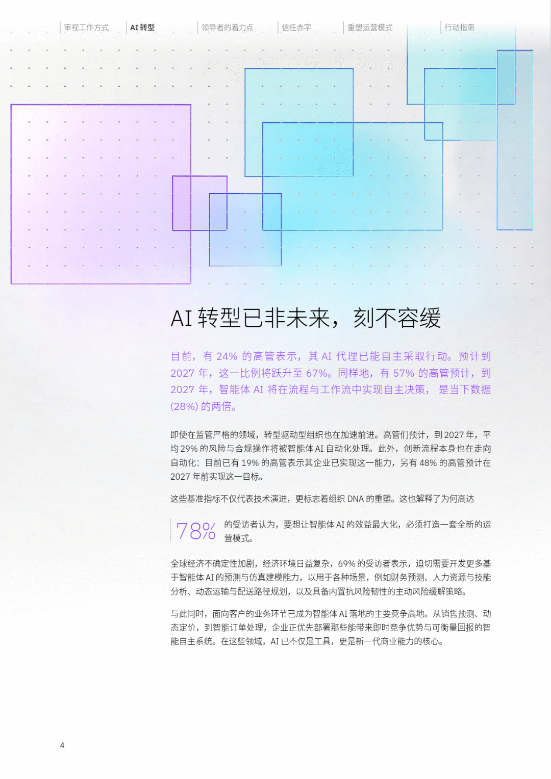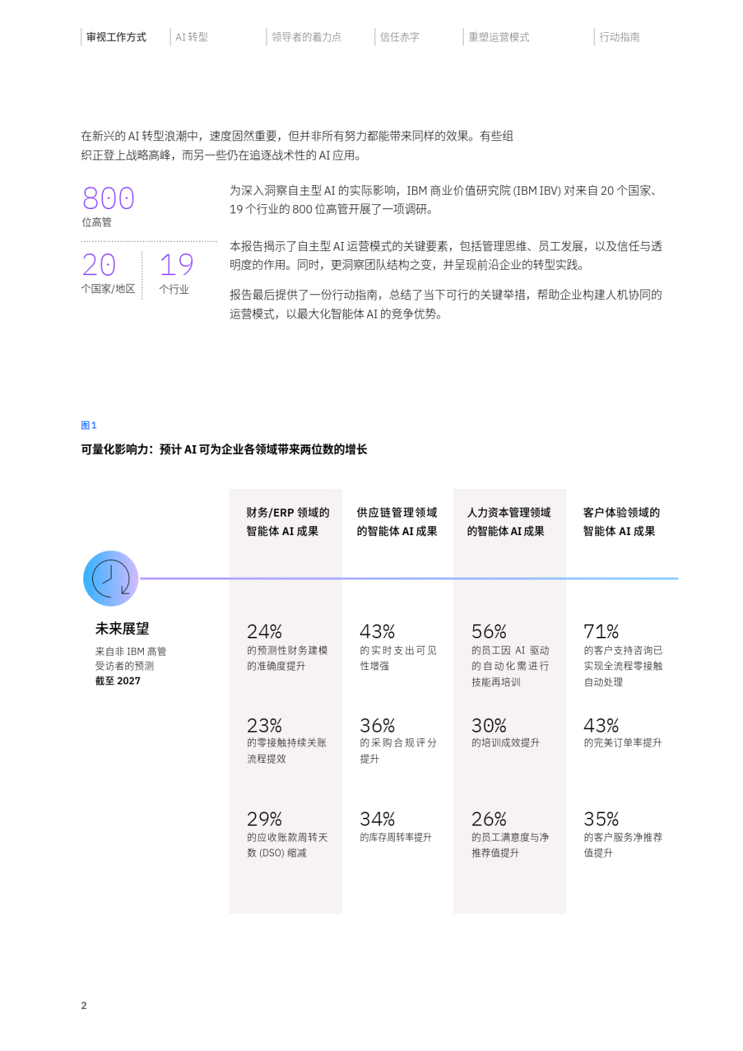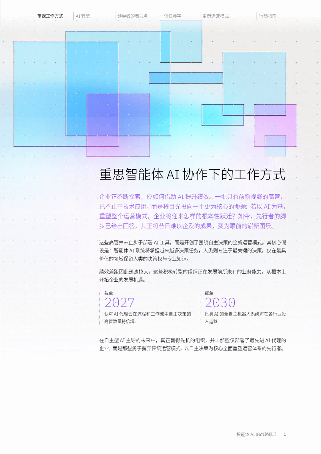 报告由IBM商业价值研究院发布,基于对20个国家、19个行业的800位高管调研,聚焦智能体AI的战略价值与转型路径,揭示其从流程优化到运营模式重塑的核心跃迁方向。