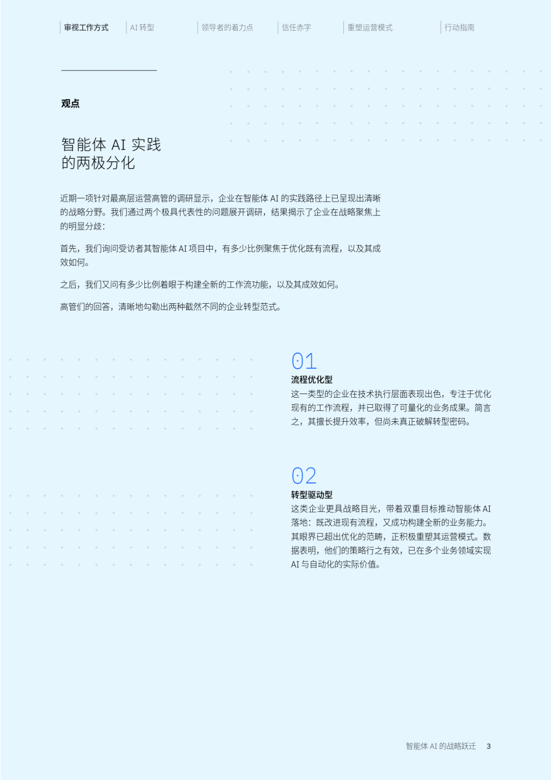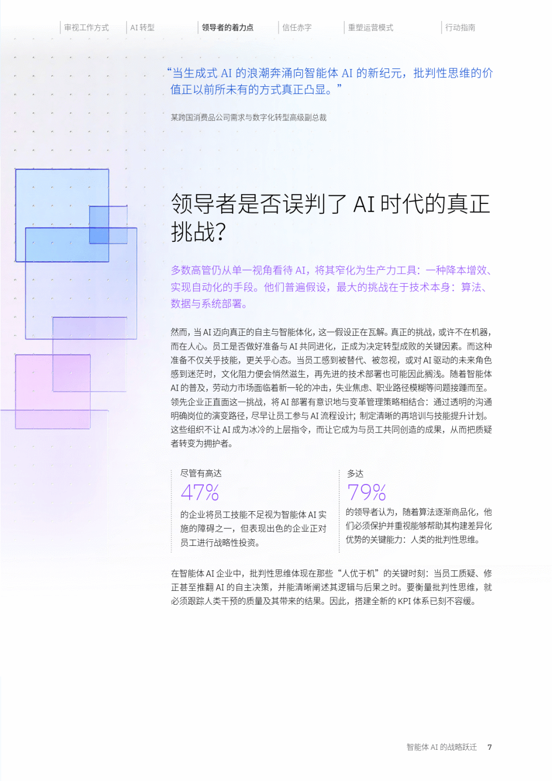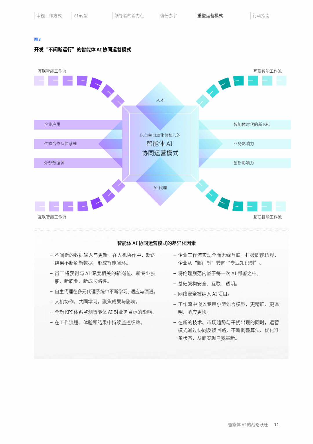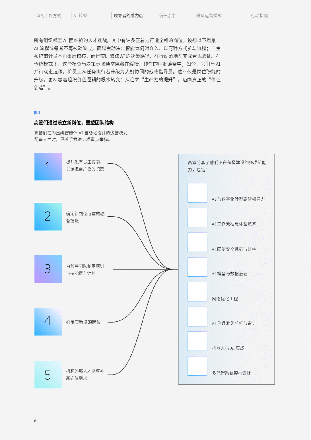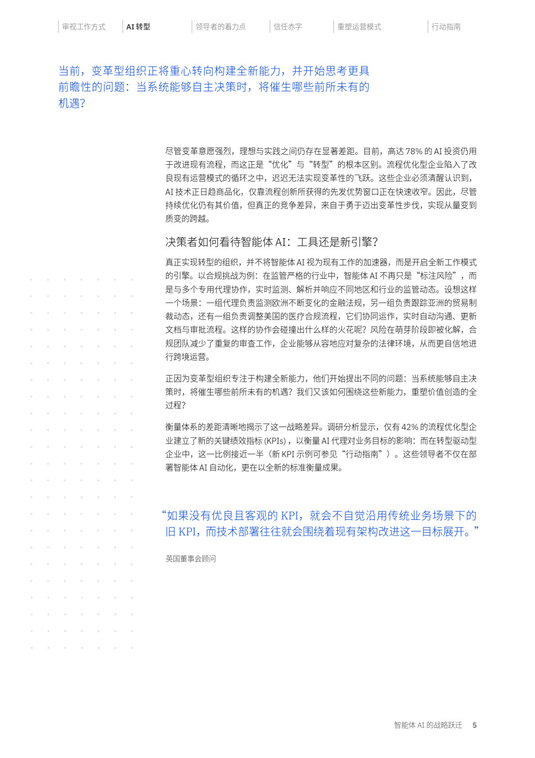报告提出五大行动指南:一是设定与战略挂钩的AI目标,任命对业务盈亏负责的高管;二是优先在财务、供应链等高价值领域部署AI代理,实现可量化突破;三是重构衡量体系,建立“代理-人工交接率”等新KPI;四是打造双向学习文化,开展AI协作培训,培育新型复合人才;五是保障代理决策的可见性与合规性,建立决策日志与实时监控机制。