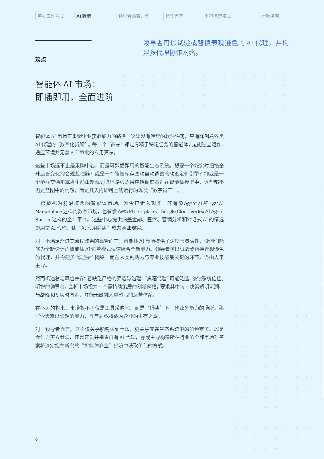 智能体市场的兴起为转型提供支撑,企业可通过AWS Marketplace等平台快速组合能力,但需建立严格筛选与治理机制,避免“黑箱代理”侵蚀信任。未来,智能体AI将重塑人、数据与决策的关系。那些围绕自主决策重构体系、平衡技术创新与信任构建的组织,将在智能体商业经济中占据主导地位,实现从效率提升到价值创造的根本性跃迁。报告由IBM商业价值研究院发布,基于对20个国家、19个行业的800位高管调研,聚
