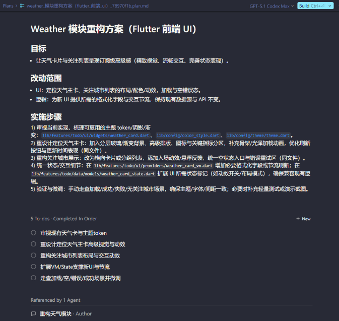 你可以对文件进行编辑:增删任务、调整任务顺序、更新技术细节、调整实现方法等。确定无误后,点击 Build,Agent 会读取最新版本的 plan.md,并完成对应的任务。