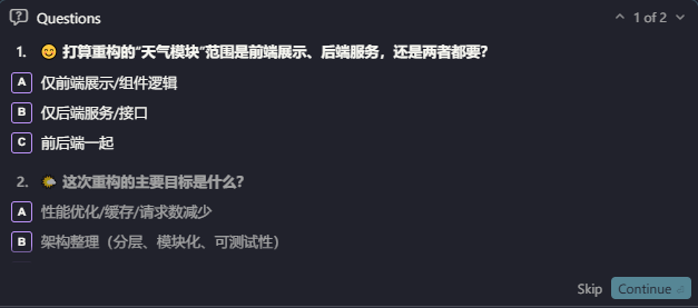 Cursor 不会直接假设你的需求,而是询问一系列澄清问题: