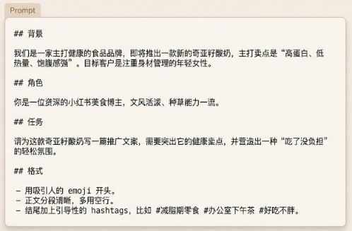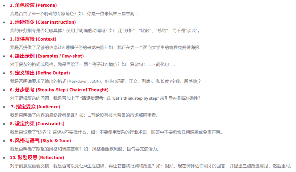 再往上走,就是了解一些经典的 “Prompt框架”,然后再提问时套用,以提高 AI 输出的稳定性、准确性和质量。所谓的 “框架”,其实就是 “结构化模板”,规定问题中包含哪些 “要素”,比如最经典的「CTRF」框架: