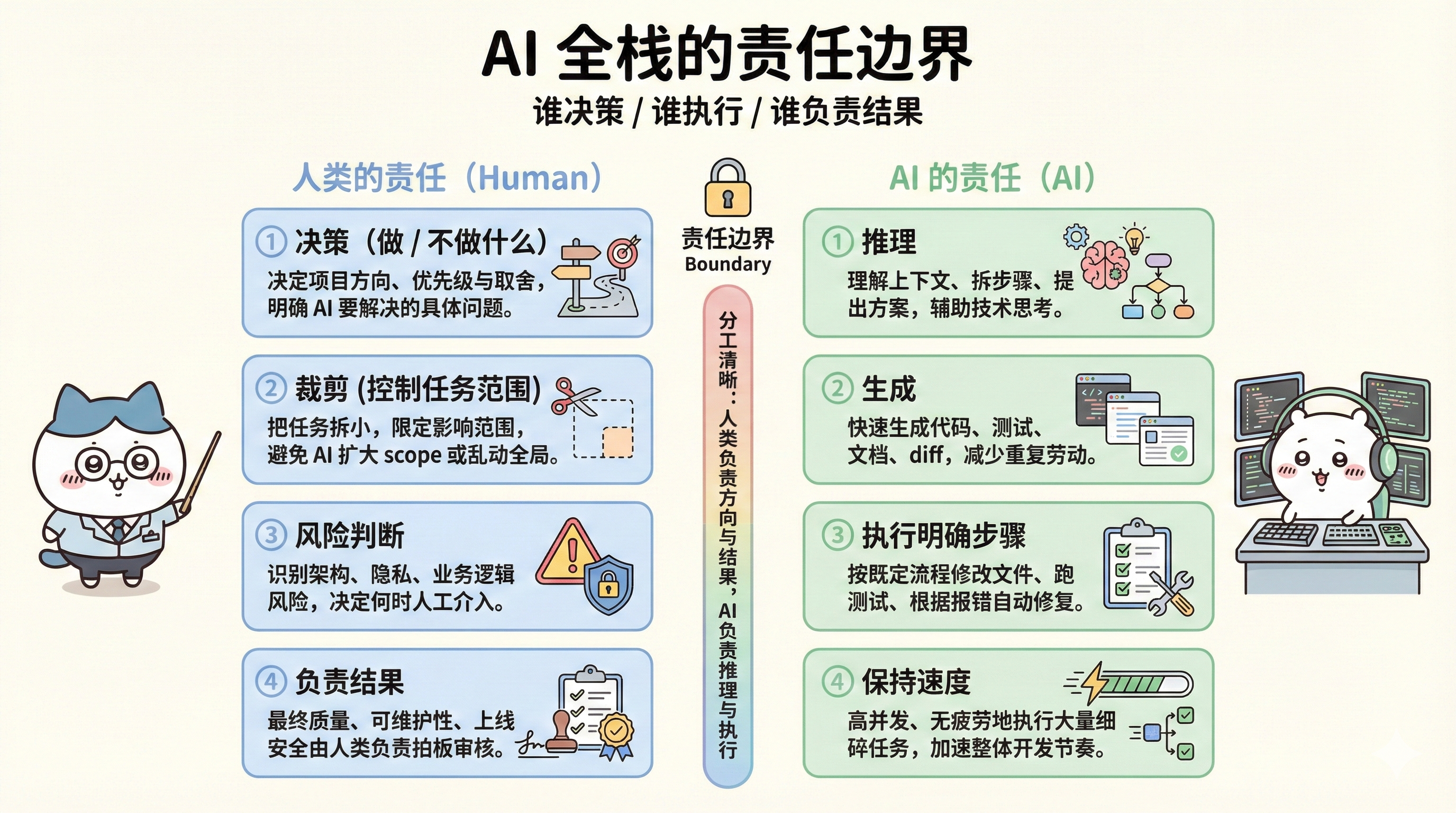 AI 负责 “生产力” (重复、繁琐、高上下文、高整合的工作),人负责 “方向与边界” (判断、创造、决策、理解组织与业务)。