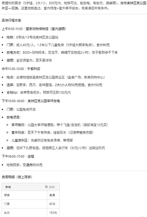 - ✅ 有条理说法:周末想带5岁孩子一日游,2大1小,预算500以内,北京,不想跑太远,能放电、有吃饭的地方、避开暴晒,地铁可达最好。