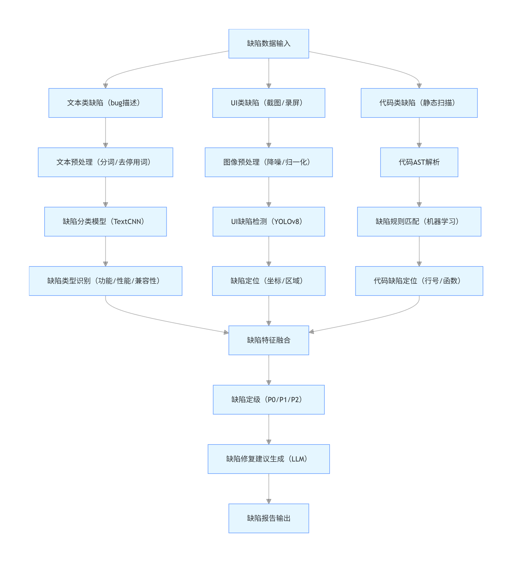 - 智能缺陷检测:TextCNN 分类缺陷类型,YOLOv8 检测 UI 缺陷,LLM 生成修复建议,缺陷识别准确率提升 85%,修复周期缩短 50%;