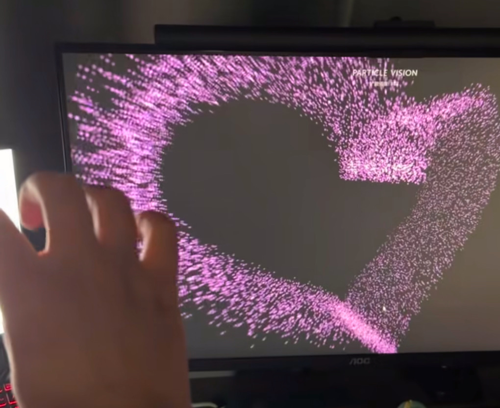 用Three.js创建一个实时交互的3D粒子系统。要求:1. 通过摄像头检测双手张合控制粒子群的收缩与扩散;2. 当手势为1时,粒子组成文字h(),当手势为2时组成文字 ()当手势为3时,组成文字 ()3.粒子需实时响应手势变化;