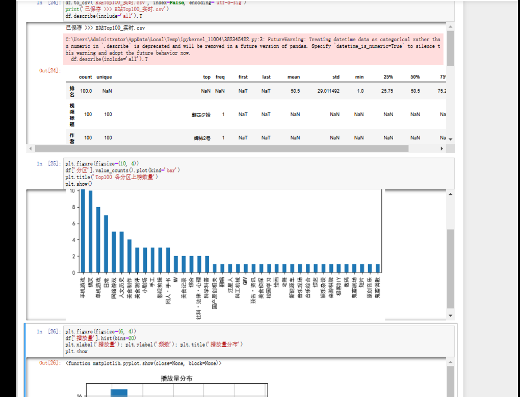 if __name__ == '__main__': video_data = get_video_info() save_to_csv(video_data) print("数据已保存为bilibili_rank.csv") - 调用