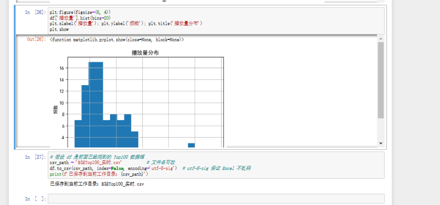 save_to_csv()保存数据。 - 去重与脏数据处理(如播放量单位统一为“万”)