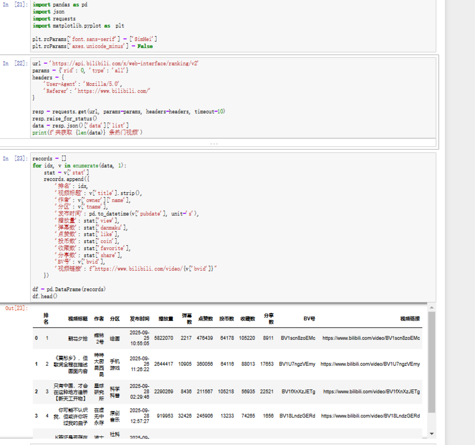1. 导入工具包,请求 B 站排行榜接口,提取数据并整理成表格