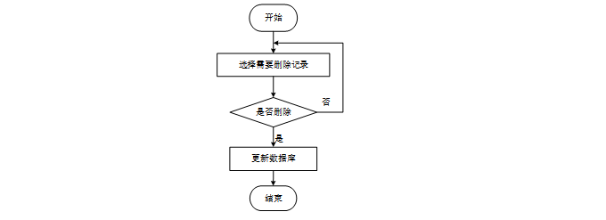 用户选择需要删除的记录后,系统判断是否确认删除。若未确认,返回选择环节;若确认删除,则更新数据库,删除对应记录,完成操作后流程结束。删除信息流程图如图4-9所示。